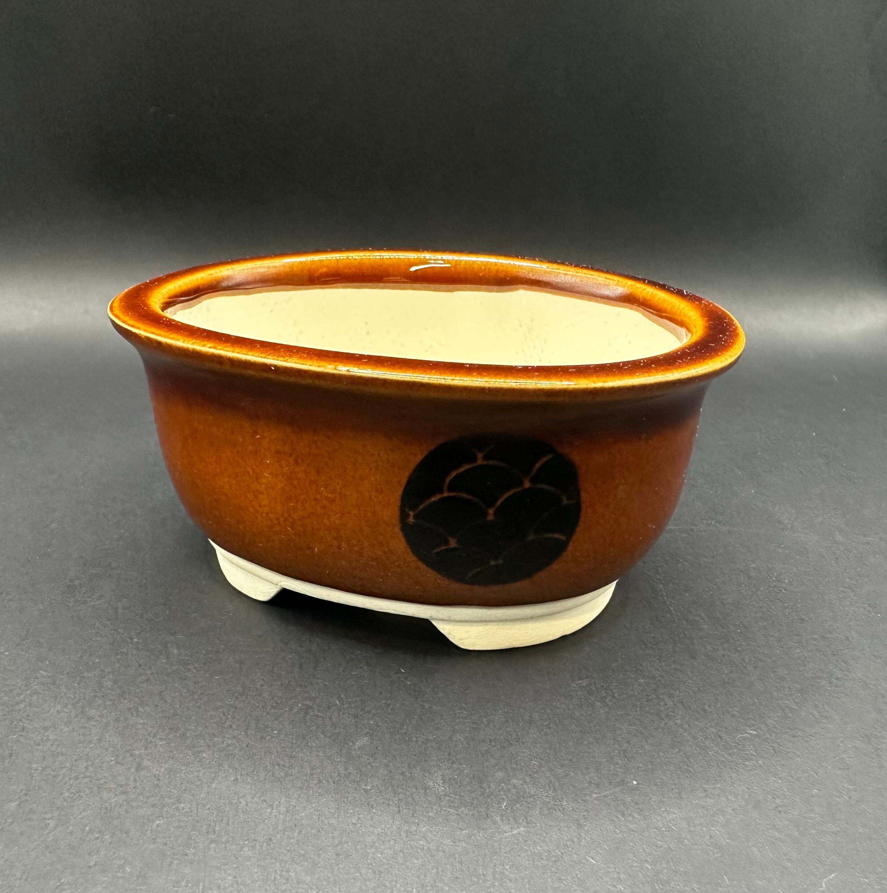 Finished in a rich amber glaze, it features a classic Japanese crest (mon) design on the side, symbolizing heritage and refinement. The warm tones of the exterior beautifully contrast with the smooth, light interior, highlighting the artistry of Japanese craftsmanship.