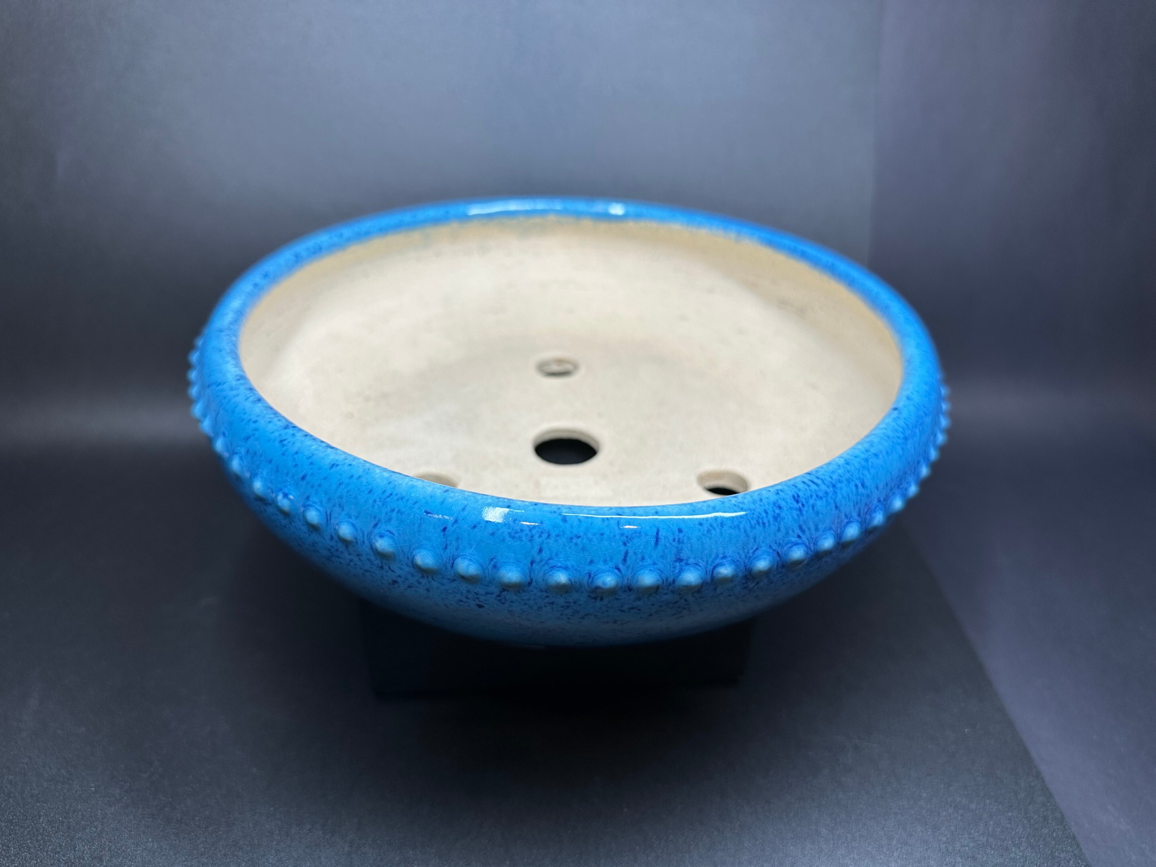 This large pot features a stunning sky blue glaze that beautifully enhances the presence of any bonsai. With its generous size and deep shape, it can accommodate larger trees with ease. The vivid sky blue color creates a striking contrast, making your bonsai stand out elegantly.