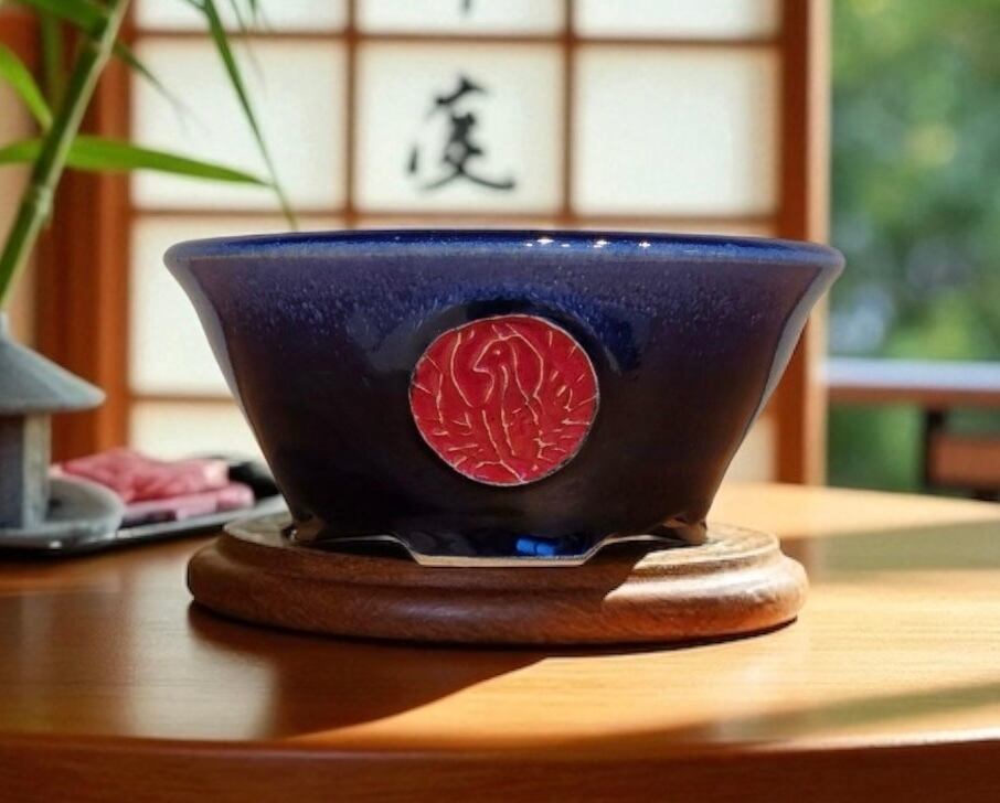 This is a rare and exceptional piece by HORIE BIKO — a true collector’s item that is rarely seen on the market. The deep blue glaze is stunning, beautifully highlighting the vivid red emblem at the center. Every element of this pot is perfectly balanced, showcasing artistic harmony at its finest.