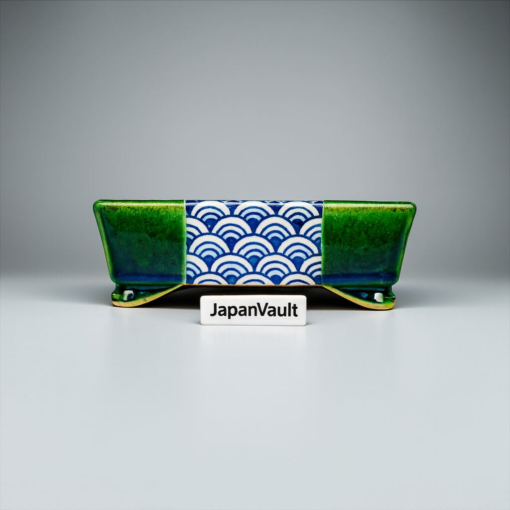 A beautifully crafted rectangular pot featuring a vibrant emerald green glaze adorned with two-tone patterns. Each side showcases a different design, offering a unique contrast that enhances its charm. This reversible design makes it a truly one-of-a-kind piece. Made by Satomi Terahata.
