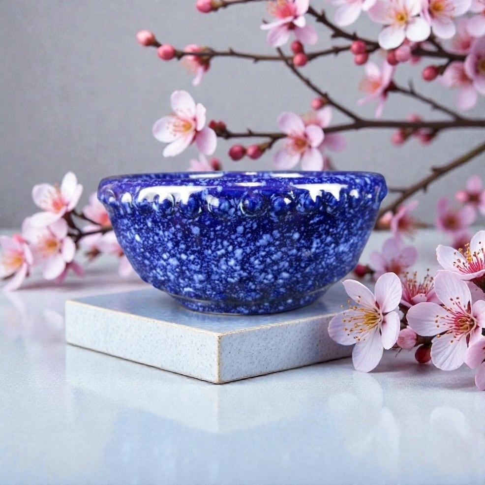 The pot features a striking deep sapphire crystal glaze, creating a snow-like pattern that shimmers beautifully under light.